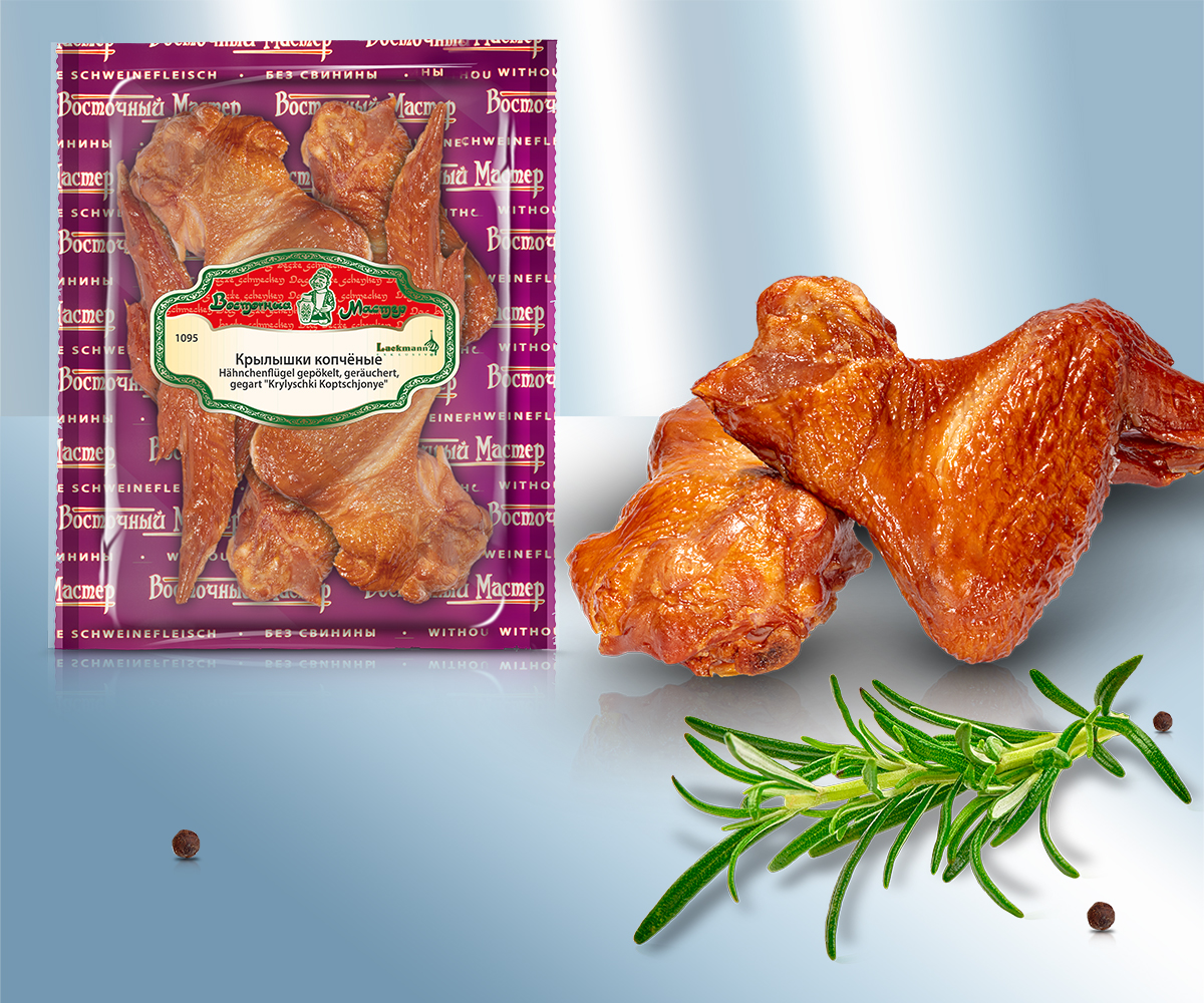 Alitas de pollo en salmuera, cocinadas y ahumadas. Ingredientes: alitas de pollo, sal de mesa, estabilizador: difosfato, extractos de especias, potenciador del sabor: glutamato monosódico, antioxidante: ascorbato de sodio, conservante: nitrito de sodio, humo. Envasado en atmósfera protectora. Valor nutricional por 100 g: Valor energético: 912 kJ / 219 kcal, Grasas: 15 g, de las cuales saturadas: 6,3 g, Hidratos de carbono: 1,0 g, de los cuales azúcares: <0,5 g, Proteínas: 20 g, Sal: 2,8 g,