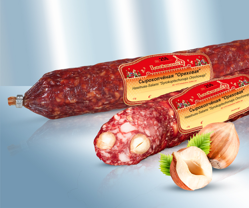 Salami de avellana. 100 g de salami elaborado con 145 g de carne de cerdo y ternera. Ingredientes: cerdo, ternera, manteca de cerdo, sal, 3 % de avellanas, especias, dextrosa, potenciador del sabor: glutamato monosódico, antioxidantes: ácido ascórbico, aromas, estabilizante: difosfato, extractos de especias, cultivos iniciadores, conservante: nitrito de sodio, humo. Tripa no comestible. Valor nutricional por 100 g: Valor energético: 1556 kJ / 374 kcal, Grasas: 28 g, de las cuales saturadas: 12 g, Hidratos de carbono: 2,8 g, de los cuales azúcares: <0,5 g, Proteínas: 28 g, Sal: 3,4 g,