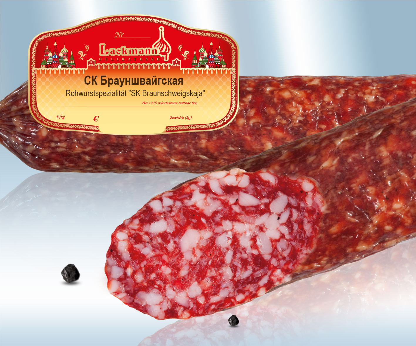 Salami al estilo ruso. 100 g de producto elaborado con 140 g de carne de cerdo y ternera. Ingredientes: cerdo, ternera, manteca de cerdo, sal, especias, dextrosa, potenciador del sabor (monoglutamato monosódico), antioxidantes (ácido ascórbico), extractos de especias, fermentos lácticos, conservante (nitrito de sodio), humo. Tripa no comestible. Valor nutricional por 100 g: Valor energético: 1601 kJ / 386 kcal, Grasas: 31 g, de las cuales saturadas: 13 g, Hidratos de carbono: 1,0 g, de los cuales azúcares: <0,5 g, Proteínas: 26 g, Sal: 3,4 g,
