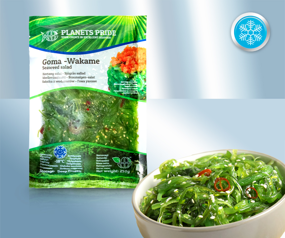 Ensalada de algas congeladas. Ingredientes: ensalada de algas 73,3%, aceite de sésamo, azúcar, agar, semillas de sésamo, fructosa, ácido acético, hongo de madera chino Mu'er, mirin, chile molido, goma guar, colorante: (E102*, (E133). *E102: puede afectar negativamente a la actividad y concentración en niños. Vida útil a ≤ -18 °C hasta: ver en el envase. Número de lote: ver en el envase. Valor nutricional por 100g: Valor energético: 272 kJ / 65 kcal, Grasas: 3,7g, - de los cuales ácidos grasos saturados: 1,3g, Carbohidratos: 41g, - de los cuales azúcares: <0,5g, Proteínas: 19g, Sal: 6,0g,