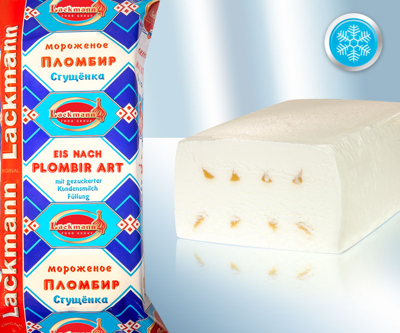 Helado "Leche condensada". 1000 ml. Ingredientes: agua, aceite de coco, azúcar, relleno con leche condensada y azúcar 10,7% (jarabe de glucosa y fructosa, leche condensada con azúcar 24% (leche, azúcar), azúcar, agua, grasas y aceites vegetales (palma, karité), sal, espesante (E440), jarabe de caramelo, aroma, corrector de acidez (E331), antioxidantes (E300)), proteínas de la leche, leche desnatada en polvo, jarabe de glucosa, emulgente (E471), estabilizantes (E410, E412, E407), aroma natural (contiene leche). No volver a congelar el producto descongelado. Consumir preferentemente antes de: ≤ -18 °C (ver anverso). Distribución: Lackmann Fleisch- und Feinkostfabrik GmbH, Carl Benz Straße 10, 77731 Willstätt, Alemania. Valor nutricional por 100 g: Valor energético: 970 kJ / 232 kcal, Grasas: 14 g, de las cuales saturadas: 12 g, Hidratos de carbono: 25 g, de los cuales azúcares: 24 g, Proteínas: 2,1 g, Sal: 0,19 g,
