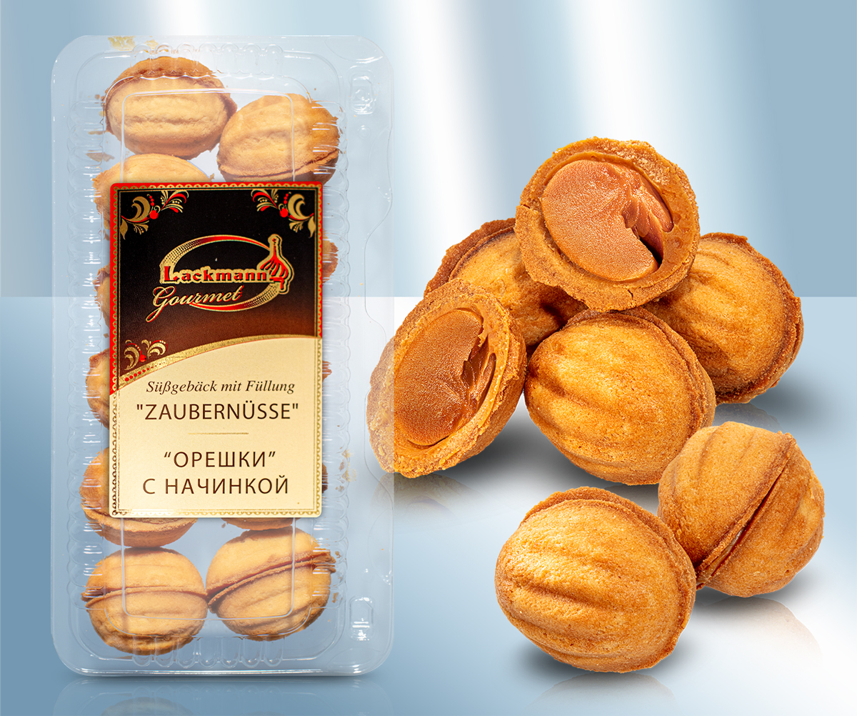 Dulce de harina con relleno . Ingredientes: Relleno 49% (Azúcar, agua, Leche desnatada en polvo, Grasa de palma, espesantes: (Almidón modificado, E509, E407, E440), estabilizadores: (E451, E452), conservante: (E202)), harina de trigo, Grasa de confitería: (grasas y aceites vegetales: (Palma, Colza), agua, emulgentes: (E471, lecitina), sal de calidad alimentaria, colorante: (E160a), aroma), Azúcar, huevo completo en polvo , Jarabe de glucosa, gasificante: (E450, E500), conservante: (E200), sal de calidad alimentaria, aroma. Este producto puede tener trazas de: Centeno, cebada, Avena, cacahuetes, Soja, avellanas, Nueces, Sésamo. Almacenar en un lugar fresco y seco. Consumir preferentemente antes de: ver etiqueta. Comercialización: Lackmann Fleisch- und Feinkostfabrik GmbH, Carl Benz Straße 10, 77731 Willstätt, Alemania. Valores energéticos y nutricionales medios por 100g: Valor energético: 1776 kJ / 424 kcal, Grasas: 20g, - de las cuales ácidos grasos saturados: 8,5g, Hidratos de Carbono: 55g, - de los cuales azúcares: 29g, Proteínas: 6,6g, Sal: 0,30g,