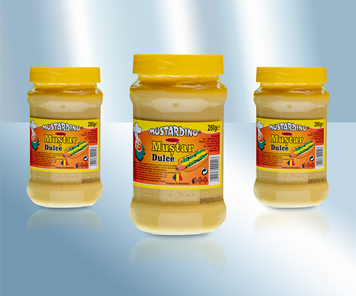 Пряный соус сладкий, с горчичным порошком.. Состав: питьевая вода, Горчичный порошок 20%, винный уксус, сахар, пшеничная мука, йодированная соль (пищевая соль, йодид калия), подсолнечное масло, cпеции, красители: бета-каротин, Витамин B2. Хранить в сухом прохладном месте. Употребить до: см. оттиск, см. нижний край банки . дистрибьютор: SC RAAL MODE SRL, Parc industrial Borș nr 5J, Localitatea Bors, Jud Bihor, Romania. Пищевая ценность на 100g: Энергетическая ценность: 533 kJ / 127 kcal, Жиры: 4,8g, - из них насыщенных жирных кислот: 0,3g, Углеводы: 15g, - из них сахара: 8,7g, Белки: 5,6g, Соль: 3,0g,