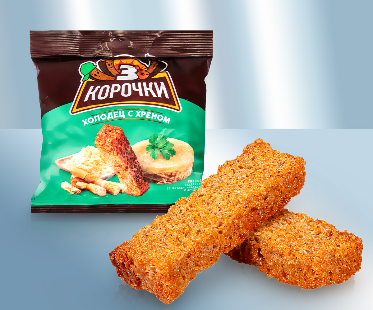 Сухарики ржаные со вкусом холодца с хреном.. вариант сервировки показан на рисунке. Состав: Pжаной хлеб 86,8%: (ржаная мука 44,3%, пшеничная мука вода), подсолнечное масло, антиоксиданты: (E319), смесь пряностей (пищевая соль, глюкоза, мальтодекстрин, Усилитель вкуса: (E621, E627, E631), Горчичный порошок, ароматизаторы, дрожжевой экстракт, Регуляторы кислотности: (E330, E262), пищевая соль, дрожжи. Хранить в сухом прохладном месте. Данный продукт может содержать следы: ракообразные, рыба, молоко, сельдерей, соя. дата на упаковке является датой изготовления / упаковки. Сбыт: Lackmann Fleisch- und Feinkostfabrik GmbH, Carl Benz Straße 10, 77731 Willstätt, Германия. Употребить до: см. оттиск, вторая строка. Пищевая ценность на 100g: Энергетическая ценность: 1630 kJ / 390 kcal, Жиры: 10g, - из них насыщенных жирных кислот: 1,8g, Углеводы: 64g, - из них сахара: 3,1g, Белки: 10g, Соль: 3,4g,