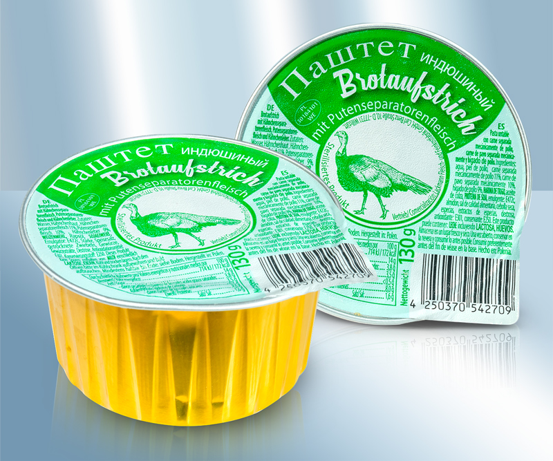 Паста для бутербродов С куриным мясом механической обвалки, мясо индейки механической обвалки и Куриная печень.. Состав: вода, Куриная кожа, Куриное мясо механической обвалки 11%, мясо индейки механической обвалки 10%, Куриная печень 9%, пшеничная мука, рапсовое масло, соевый белок, Эмульгатор: (E472c), крахмал, пищевая соль, сушёный лук, cпеции, экстракты специй, декстроза, антиоксиданты: (E301), консервирующее вещество: (E250). Данный продукт может содержать следы: молоко, лактоза, Яйца. Хранить в сухом прохладном месте. После вскрытия упаковки хранить в холодильнике и употребить в кратчайшие сроки. Употребить до конца см. дно. Сбыт: Lackmann Fleisch- und Feinkostfabrik GmbH, Carl Benz Straße 10, 77731 Willstätt, Германия. Пищевая ценность на 100g: Энергетическая ценность: 714 kJ / 172 kcal, Жиры: 14g, - из них насыщенных жирных кислот: 3,8g, Углеводы: 3,5g, - из них сахара: <0,5g, Белки: 8,0g, Соль: 1,6g,