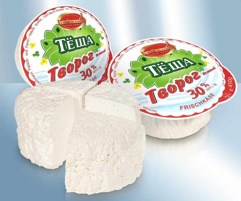 Творог 30% жир в сухом веществе.. Сбыт: Lackmann Fleisch- und Feinkostfabrik GmbH, Carl Benz Straße 10, 77731 Willstätt, Германия. Срок хранения при +1-+10°C до: Пищевая ценность на 100g: Энергетическая ценность: 628 kJ / 150 kcal, Жиры: 8,0g, - из них насыщенных жирных кислот: 5,0g, Углеводы: 3,5g, - из них сахара: 3,5g, Белки: 16g, Соль: 0,10g,