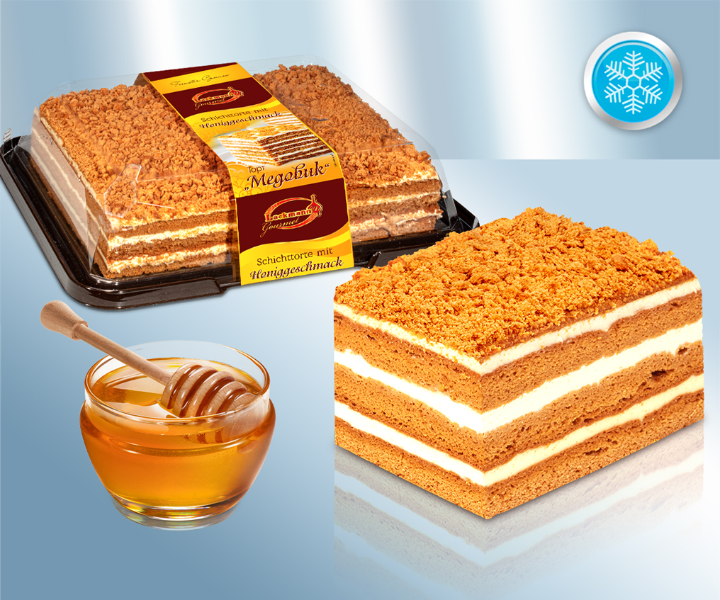 Tорт с медовым вкусом, замороженный. Состав: сметана, пшеничная мука, сахар, цельное яйцо, вода, разрыхлитель: (E500), мед 0,7%, пищевая соль. Данный продукт может содержать следы: Миндаль, Фундук, соевые бобы. Размороженный продукт не замораживать повторно. и Нераскрытый После размораживания хранить при температуре максимум +6 °C 7 дней. Приготовления: Разморозить торт перед подачей на стол. В холодильнике время разморозки составляет около 10 ч. После открытия хранить в холодильнике и использовать в течение 2 дней. Срок хранения при ≤ -18 °C до: см. информацию на упаковке сверху, первая строка. номер партии: см. информацию на упаковке сверху, вторая строка. Сбыт: Lackmann Fleisch- und Feinkostfabrik GmbH, Carl-Benz-Straße 10, 77731 Willstätt, Deutschland. Пищевая ценность на 100g: Энергетическая ценность: 1307 kJ / 311 kcal, Жиры: 13g, - из них насыщенных жирных кислот: 6,9g, Углеводы: 43g, - из них сахара: 23g, Белки: 5,1g, Соль: 0,65g,