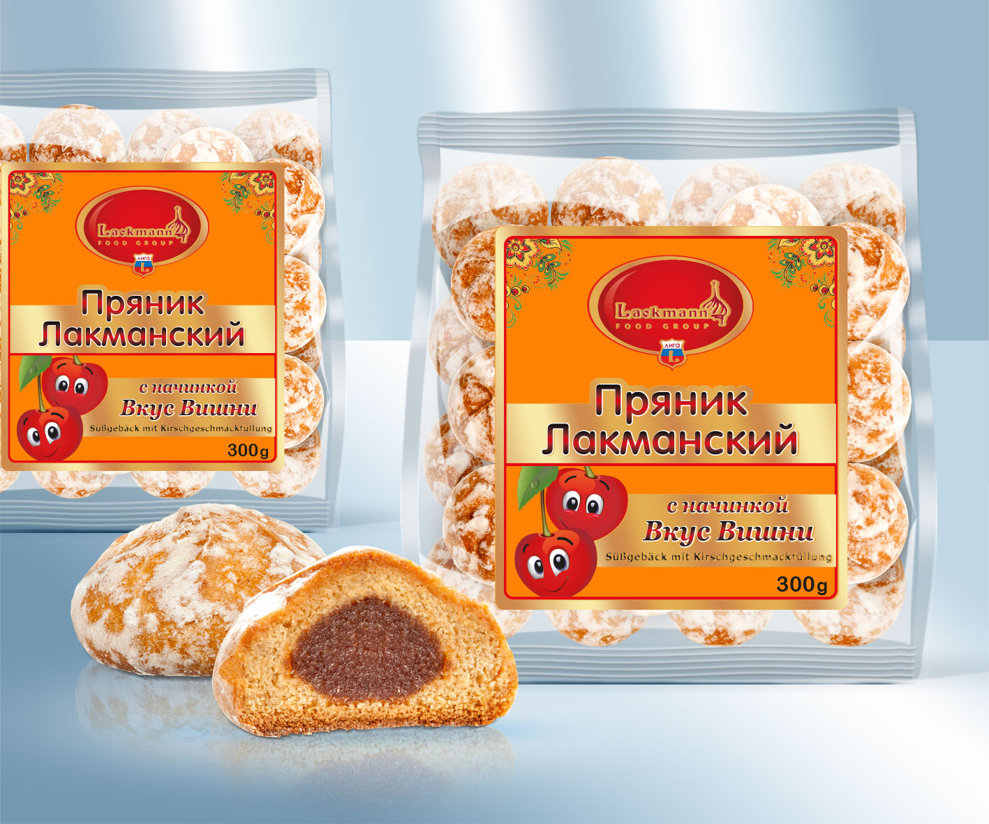 Кондитерское изделие с начинкой со вкусом вишни. . Состав: пшеничная мука, сахар, Начинка со вкусом вишни 18% (яблоки, сахар, загуститель: (пектин), pегулятор кислотности: (E330), консервирующее вещество: (E202), ароматизатор), вода, инвертный сахарный сироп (сахар, вода, pегулятор кислотности: (E330, E500)), глюкозно-фруктозный сироп, растительные жиры и масла (ши (масляное дерево), пальма), Разрыхлитель теста: (E503, E500), порошок цельного яйца, карамельный сироп, cпеции. Данный продукт может содержать следы: овес, рожь, Горчица, ячмень, молоко, Арахис, Орехи, соя, кунжут. Хранить в сухом прохладном месте. Сбыт: Lackmann Fleisch- und Feinkostfabrik GmbH, Carl Benz Straße 10, 77731 Willstätt, Германия. Употребить до: см. оттиск. Пищевая ценность на 100g: Энергетическая ценность: 1514 kJ / 358 kcal, Жиры: 3,9g, - из них насыщенных жирных кислот: 1,7g, Углеводы: 74g, - из них сахара: 39g, Белки: 6,1g, Соль: 0,10g,