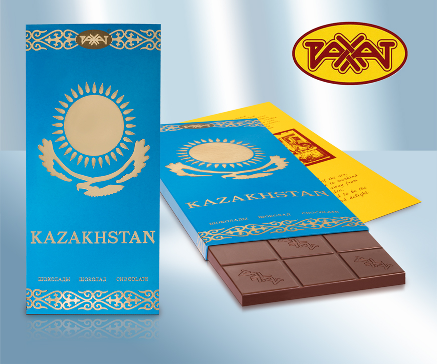 Шоколад "Казахстан".. Страна-производитель: Казахстан. Какао: 45% минимум. Состав: сахар, какао-масса, масло какао, сывороточный продукт, сухое цельное молоко, Эмульгатор: (лецитин (соя)), экстракт ванили. Хранить в сухом прохладном месте. Употребить до: см. оттиск, вторая строка. Сбыт: Lackmann Fleisch- und Feinkostfabrik GmbH, Carl Benz Straße 10, 77731 Willstätt, Германия. Пищевая ценность на 100g: Энергетическая ценность: 2215 kJ / 532 kcal, Жиры: 32g, - из них насыщенных жирных кислот: 21g, Углеводы: 50g, - из них сахара: 50g, Белки: 6,7g, Соль: 0,19g,
