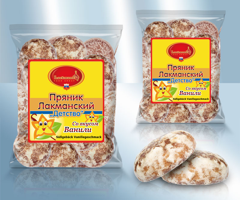 Пряник Лакманский "Детство" со вкусом ванили . Состав: пшеничная мука, сахар, вода, глюкозно-фруктозный сироп, рапсовое масло, декстроза, pегулятор кислотности: (E330, E500), Разрыхлитель теста: (E500, E503), ароматизатор. Данный продукт может содержать следы: овес, рожь, ячмень, яйца, молоко, арахисовые орехи, лесные орехи, грецкие орехи, Горчица, орехи кешью, соя. кунжут. Хранить в сухом прохладном месте. Сбыт: Lackmann Fleisch- und Feinkostfabrik GmbH, Carl Benz Straße 10, 77731 Willstätt, Германия. Употребить до: см. оттиск на упаковке, См. на лицевой стороне. Пищевая ценность на 100g: Энергетическая ценность: 1525 kJ / 360 kcal, Жиры: 3,3g, - из них насыщенных жирных кислот: 0,4g, Углеводы: 77g, - из них сахара: 39g, Белки: 5,4g, Соль: 0,10g,