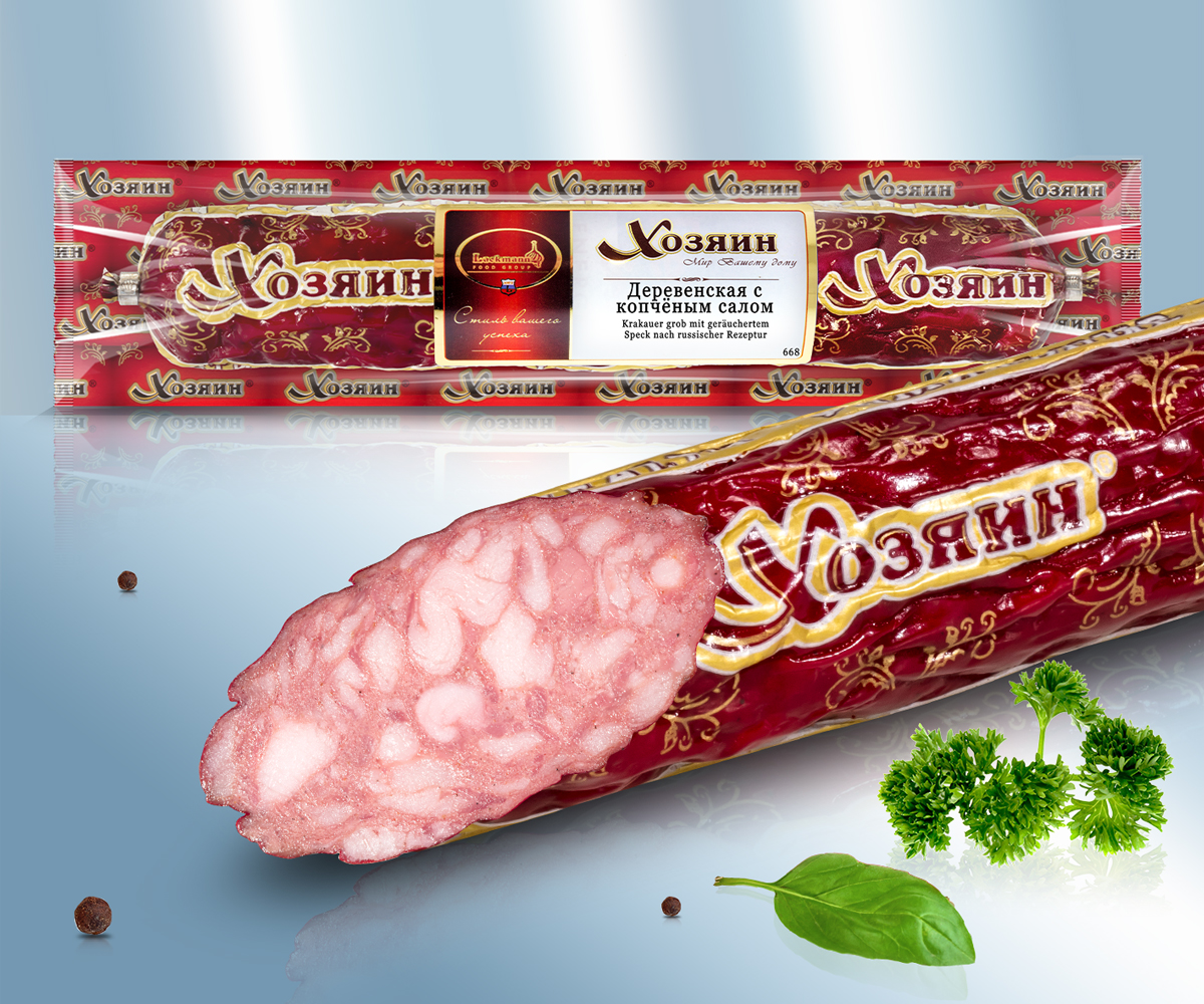 краковская колбаса грубого помола по русскому рецепту . Состав: свинина 80%, Сало, поваренная соль, cпеции, декстроза, глюкозный сироп, усилитель вкуса: моноглутамат натрия, специи, экстракты специй, стабилизатор: дифосфат, Подкислитель: лимонная кислота, Краситель: натуральный кармин, aнтиоксиданты: аскорбиновая кислота, консервирующее вещество: нитрит натрия, ароматизаторы, дым. Пищевая ценность на 100g: Энергетическая ценность: 1474 kJ / 356 kcal, Жиры: 32g, - из них насыщенных жирных кислот: 13g, Углеводы: 1,0g, - из них сахара: <0,5g, Белки: 17g, Соль: 2,2g,