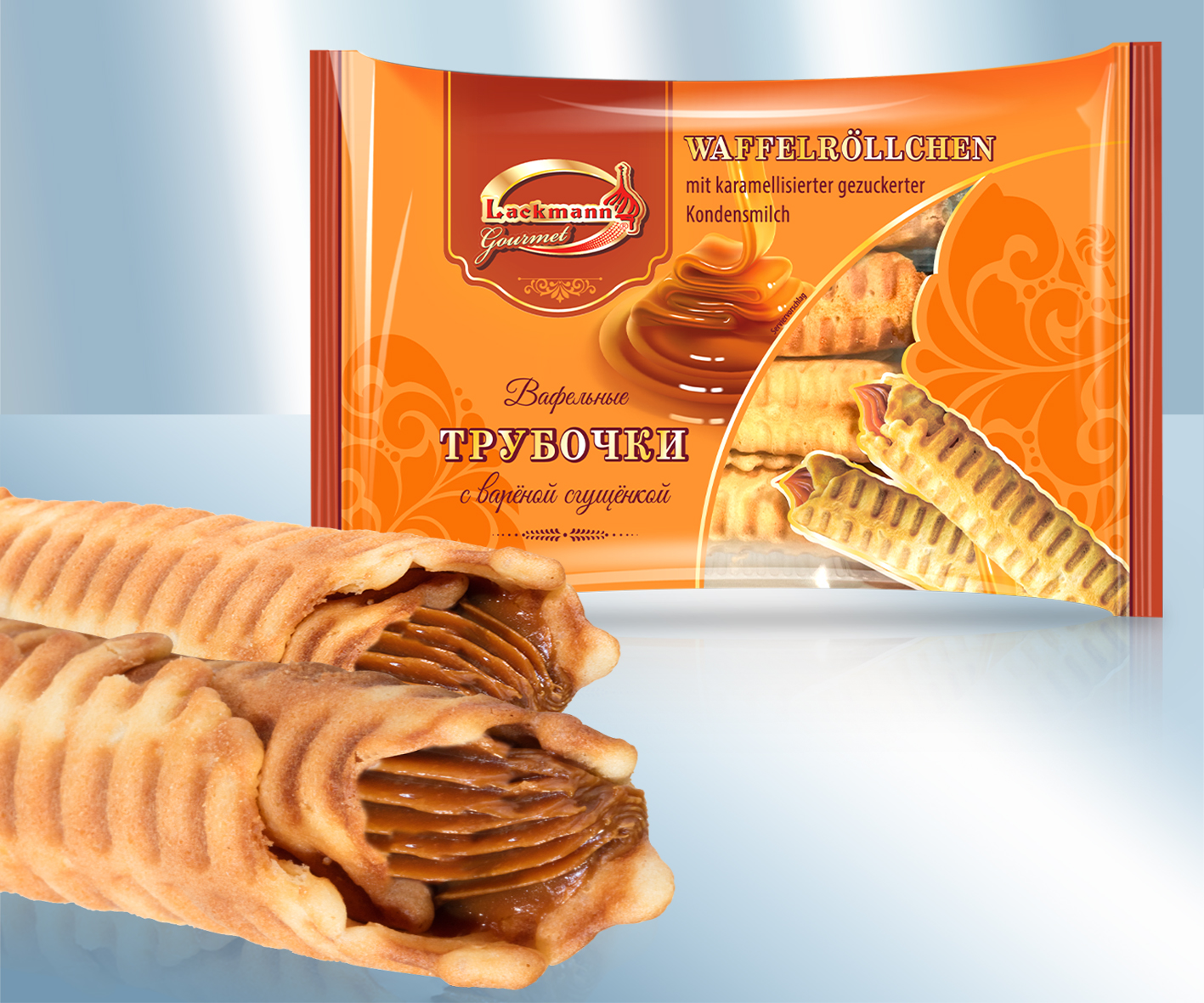 Вафельные трубочки с варёным сгущенным молоком.. Состав: вафельные рулетики 51% (цельное куриное яйцо, маргарин (растительные жиры и масла (пальма, рапс), вода, Эмульгатор (E471, E322), пищевая соль, Краситель (E160a), ароматизатор), пшеничная мука, сахар, ароматизатор, cтабилизатор: (E414), консервирующее вещество: (E202)), карамелизированное сгущенное молоко 49% (цельное молоко, сахар, сухое цельное молоко, cтабилизатор: E407). Употребить до: Хранить в сухом прохладном месте. Защитить от прямых солнечных лучей. Сбыт: Lackmann Fleisch- und Feinkostfabrik GmbH, Carl-Benz-Straße 10, 77731 Willstätt, Deutschland. Пищевая ценность на 100g: Энергетическая ценность: 1860 kJ / 444 kcal, Жиры: 21g, - из них насыщенных жирных кислот: 9,7g, Углеводы: 54g, - из них сахара: 39g, Белки: 8,9g, Соль: 0,30g,