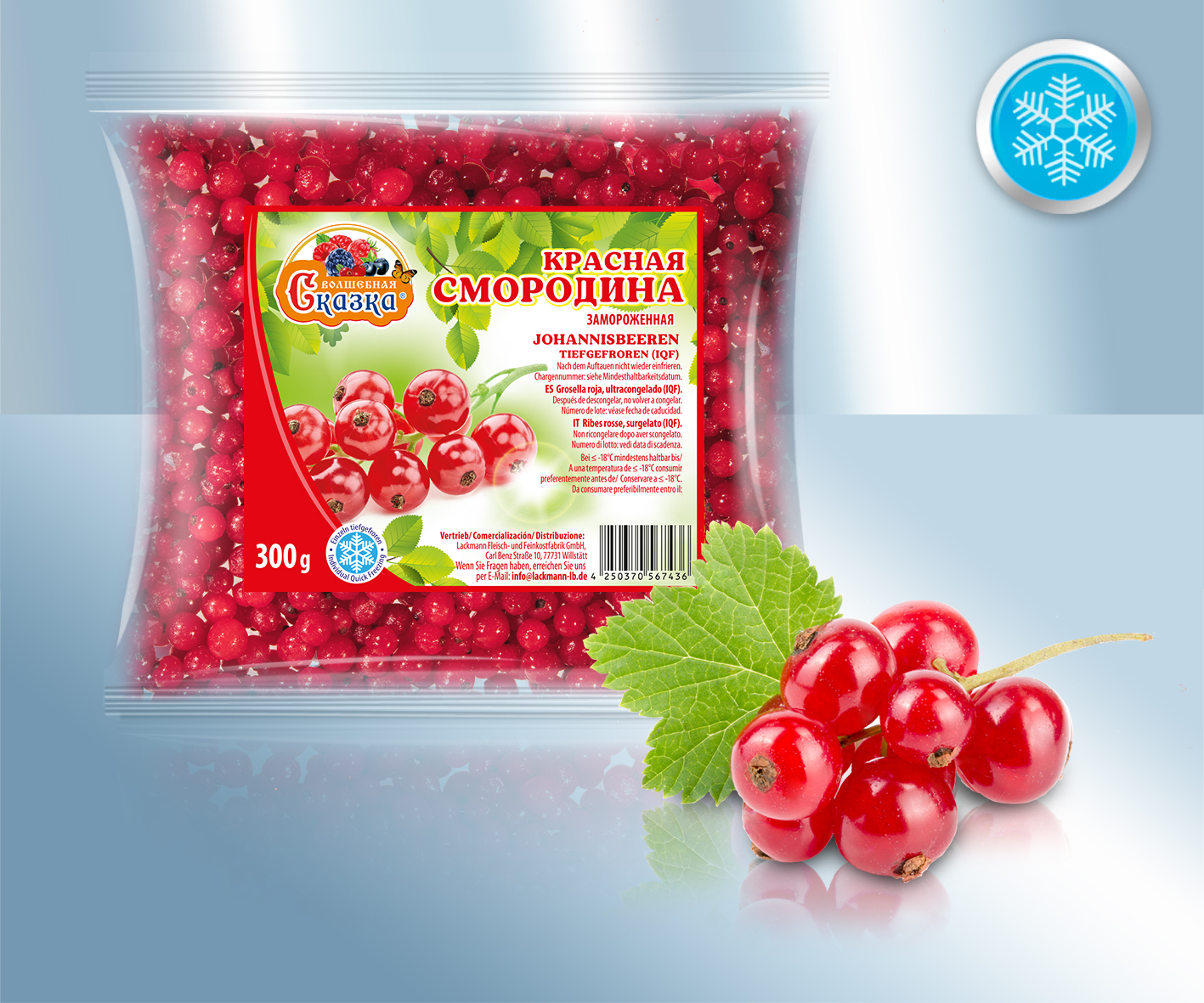 смородина, замороженные (IQF) . Размороженный продукт не замораживать повторно. Сбыт: Lackmann Fleisch- und Feinkostfabrik GmbH, Carl Benz Straße 10, 77731 Willstätt, Германия. Срок хранения при ≤ -18 °C до: см. дату на белой этикетке с текстом на немецком языке. номер партии: см. дату окончания минимального срока хранения. Пищевая ценность на 100g: Энергетическая ценность: 159 kJ / 38 kcal, Жиры: <0,5g, - из них насыщенных жирных кислот: 0g, Углеводы: 13g, - из них сахара: 5,5g, Белки: 1,1g, Соль: 0g,