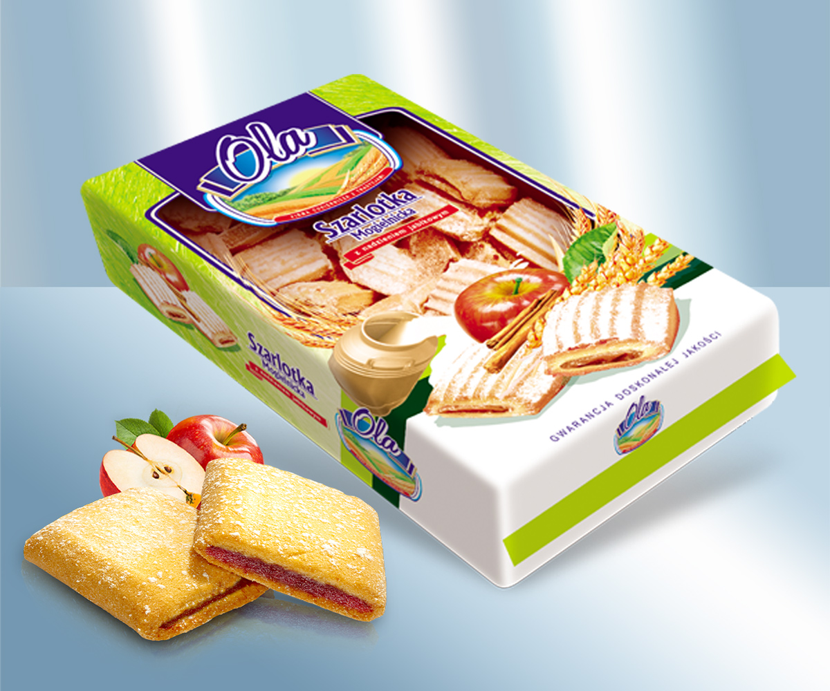 Кондитерское изделие с начинкой со вкусом яблока. Состав: пшеничная мука, Начинка со вкусом яблока 27% (яблочное пюре 49%, сахар, сливовое пюре, загуститель (E440), pегулятор кислотности (E330), корица, консервирующее вещество (E202), ароматизаторы), сахар, пальмовое масло, инвертный сахарный сироп (сахар, вода, pегулятор кислотности E330), Разрыхлитель теста (E503, E500), ароматизатор, пищевая соль, Краситель (E160a). Данный продукт может содержать следы: молоко, Яйца, соя, кунжут, сульфиты, Фундук, Арахис, Миндаль. Хранить в сухом прохладном месте. Употребить до: Изготовитель: OLA Sp. z o. o. – Ciastek, Wafli i Pierników, 05-640 Mogielnica Krzyżowa 7, Polska. la-ciastka@wp.pl, Пищевая ценность на 100g: Энергетическая ценность: 1812 kJ / 432 kcal, Жиры: 18g, - из них насыщенных жирных кислот: 9,0g, Углеводы: 63g, - из них сахара: 32g, Белки: 4,0g, Соль: 0,11g,