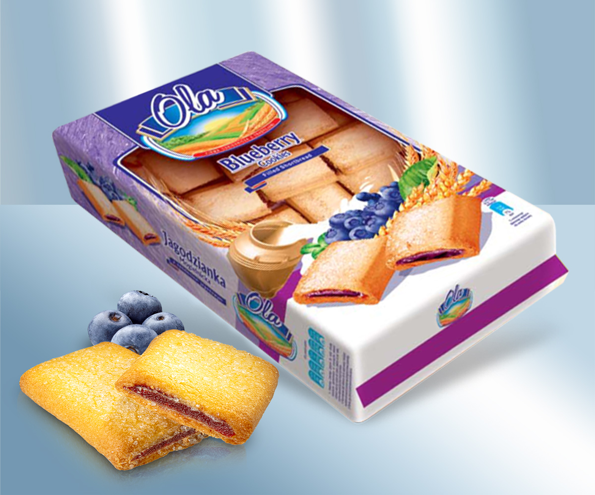 Печенье песочное наполнитель со вкусом черники.. Состав: пшеничная мука, Начинка со вкусом черники 26% (яблочное пюре, сахар, крахмальная патока, загуститель (E440), pегулятор кислотности (E330), консервирующее вещество (E202), Пюре из черноплодной рябины, ароматизатор), сахар, пальмовое масло, инвертный сахарный сироп (сахар, вода, pегулятор кислотности E330), Разрыхлитель теста: (E503, E500), ароматизатор, пищевая соль, Краситель E160a. Данный продукт может содержать следы: молоко, яйцо, соя, кунжут, сульфиты, Арахис, Фундук, Миндаль. Хранить в сухом прохладном месте. Изготовитель: OLA Sp. z o. o. – Ciastek, Wafli i Pierników, 05-640 Mogielnica Krzyżowa 7, Polska. la-ciastka@wp.pl, Минимальный срок хранения в закрытом виде составляет до: Пищевая ценность на 100g: Энергетическая ценность: 1829 kJ / 436 kcal, Жиры: 18g, - из них насыщенных жирных кислот: 9,0g, Углеводы: 63g, - из них сахара: 33g, Белки: 4,0g, Соль: 0,12g,