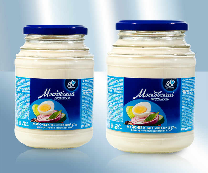 Mайонез для салатов, 67% жир. 450 мл. вариант сервировки показан на рисунке. Состав: подсолнечное масло, вода, сахар, яичный желток, пищевая соль, Регуляторы кислотности: (уксусная кислота, Молочная кислота), консервирующее вещество: (E200), cтабилизатор: (E415), горчичное масло, Краситель: (E160a). Может содержать: молоко. Хранить в сухом прохладном месте. После вскрытия упаковки хранить в холодильнике. Сбыт: Lackmann Fleisch- und Feinkostfabrik GmbH, Carl Benz Straße 10, 77731 Willstätt, Германия. Минимальный срок хранения в закрытом виде составляет до: см. крышку, вторая строка или см. горлышко бутылки, вторая строка. Пищевая ценность на 100g: Энергетическая ценность: 2520 kJ / 610 kcal, Жиры: 67g, - из них насыщенных жирных кислот: 8,7g, Углеводы: 2,3g, - из них сахара: 2,2g, Белки: <0,5g, Соль: 1,2g,