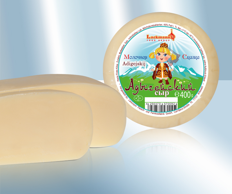 Сыр "Адыгейский" 45%, не копчёный. Состав: коровье молоко, пищевая соль, микробиологическая сычужная закваска, молочнокислые бактерии. Срок хранения при +1 °C - +6 °C до: см. информацию на упаковке сверху. Сбыт: Lackmann Fleisch- und Feinkostfabrik GmbH, Carl Benz Straße 10, 77731 Willstätt, Германия. Пищевая ценность на 100g: Энергетическая ценность: 1400 kJ / 337 kcal, Жиры: 26g, - из них насыщенных жирных кислот: 17g, Углеводы: 0,6g, - из них сахара: 0,6g, Белки: 26g, Соль: 1,9g,