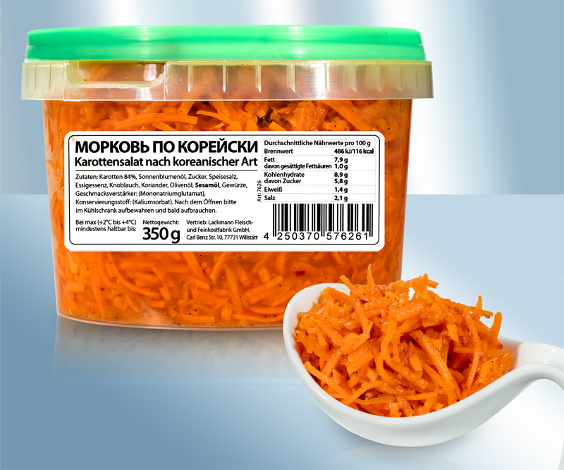 Салат из моркови по-корейски. Состав: морковь 84%, подсолнечное масло, сахар, пищевая соль, уксусная эссенция, чеснок, кориандр, оливковое масло, кунжутное масло, cпеции, Усилитель вкуса: (глутамат натрия), консервирующее вещество: (сорбат калия). После вскрытия упаковки хранить в холодильнике и употребить в кратчайшие сроки. Срок хранения при +2-+4°C до: см. крышку. Сбыт: Lackmann Fleisch- und Feinkostfabrik GmbH, Carl Benz Straße 10, 77731 Willstätt, Германия. Пищевая ценность на 100g: Энергетическая ценность: 486 kJ / 116 kcal, Жиры: 7,9g, - из них насыщенных жирных кислот: 1,0g, Углеводы: 8,9g, - из них сахара: 5,8g, Белки: 1,4g, Соль: 2,1g,