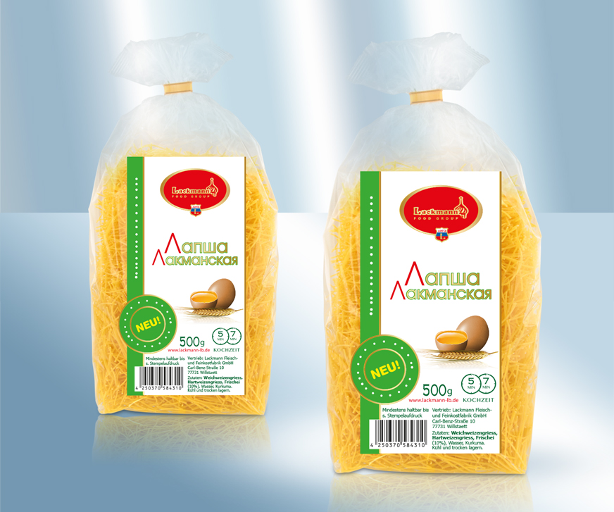 Bермишель.. Состав: крупа из мягкой пшеницы, крупа из твердых сортов пшеницы, Меланж из куриных яиц 10%, питьевая вода, куркума. поварить 5-7 минуты. Хранить в сухом прохладном месте. Употребить до: см. оттиск. Сбыт: Lackmann Fleisch- und Feinkostfabrik GmbH, Carl Benz Straße 10, 77731 Willstätt, Германия. Пищевая ценность на 100g: Энергетическая ценность: 1586 kJ / 379 kcal, Жиры: 2,0g, - из них насыщенных жирных кислот: 0,9g, Углеводы: 77g, - из них сахара: <0,5g, Белки: 12g, Соль: 0,04g,