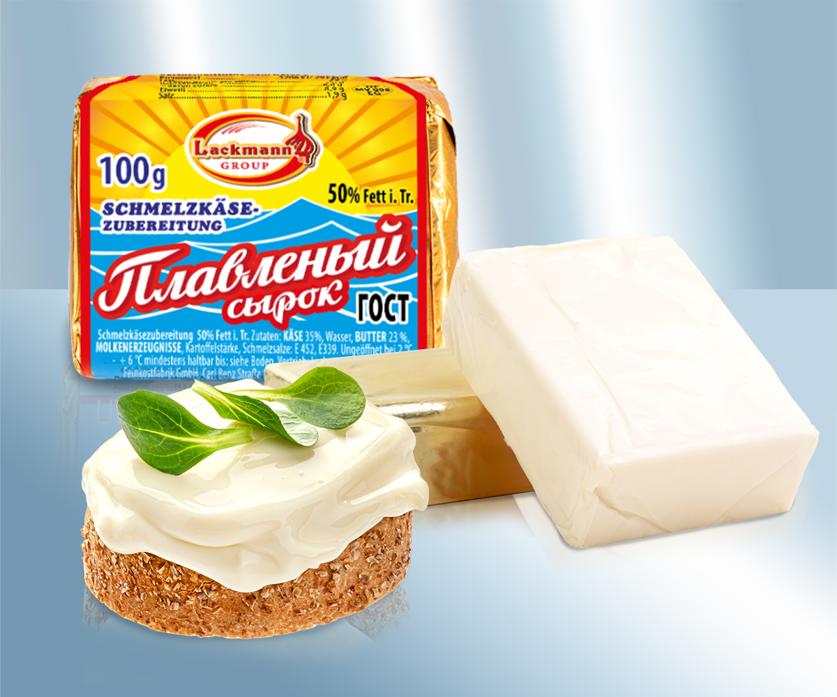Плавленый сырок. . 50% жир в сухом веществе Состав: сыр 35%, вода, масло сливочное 23%, сывороточный продукт, картофельный крахмал, Соли-плавители: (E452, E339), Употребить до: Срок хранения при +2 °C - +6 °C до: см. оттиск. Пищевая ценность на 100g: Энергетическая ценность: 1206 kJ / 291 kcal, Жиры: 24g, - из них насыщенных жирных кислот: 17g, Углеводы: 9,8g, - из них сахара: 6,6g, Белки: 8,9g, Соль: 1,9g,