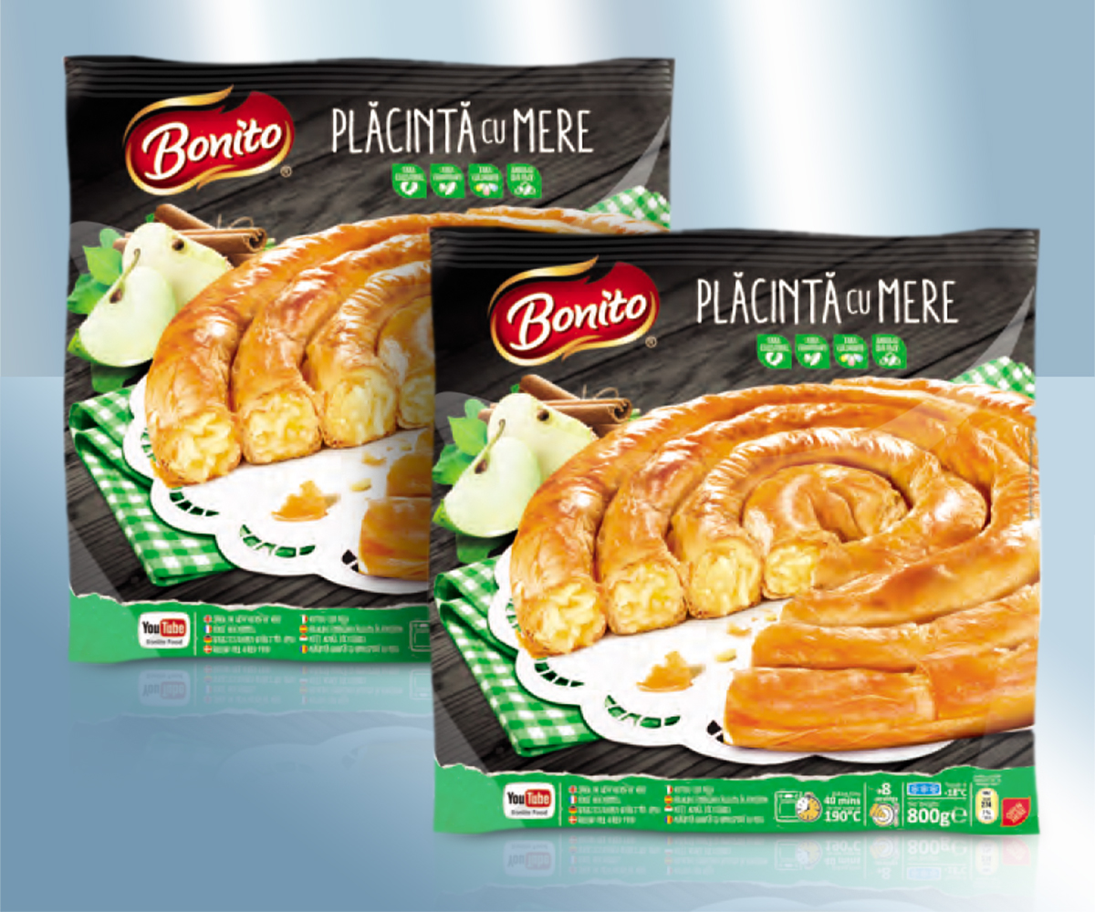 Сладкие завитушки, с яблочная начинка, сырой, замороженные. . Размороженный продукт не замораживать повторно. Перед употреблением полностью прогреть. Не предназначен для обработки в микроволновой печи. Приготовления: Разогреете духовку до 190 °С. Запекать в духовке при температуре 180-200 °C в течение 40-50 минут. Дать остыть на 10-15 минут/ы. После выпечки храните при температуре >24°C не более 4часов. Не разогревать повторно! Состав: Тесто (пшеничная мука, вода, растительные масла в изменяемых весовых долях (подсолнух, пальма), декстроза, йодированная соль (пищевая соль, йодид калия), Эмульгатор (Соевый лецитин), улучшитель хлебопекарных свойств муки (E920), Пекарский фермент: Амилаза), начинка 40% (яблоко 52%, вода, сахар, картофельные хлопья (содержат сульфиты), модифицированный крахмал (из картофель), корица, загуститель: (E466), Подкислитель: (аскорбиновая кислота, лимонная кислота), ароматизатор). Данный продукт может содержать следы: яйцо, молоко, арахис, Орехи, кунжут. Срок хранения при ≤ -18 °C до: см. оттиск, первая строка. номер партии: см. оттиск, вторая строка. Сбыт: S.C. TIP TOP FOOD INDUSTRY S.R.L., Bd. Timișoara nr. 94, Sector 6, București, Romănia. Пищевая ценность на 100g: Энергетическая ценность: 1180 kJ / 280 kcal, Жиры: 8,9g, - из них насыщенных жирных кислот: 0,3g, Углеводы: 45g, - из них сахара: 11g, Белки: 3,8g, Соль: 0,58g,
